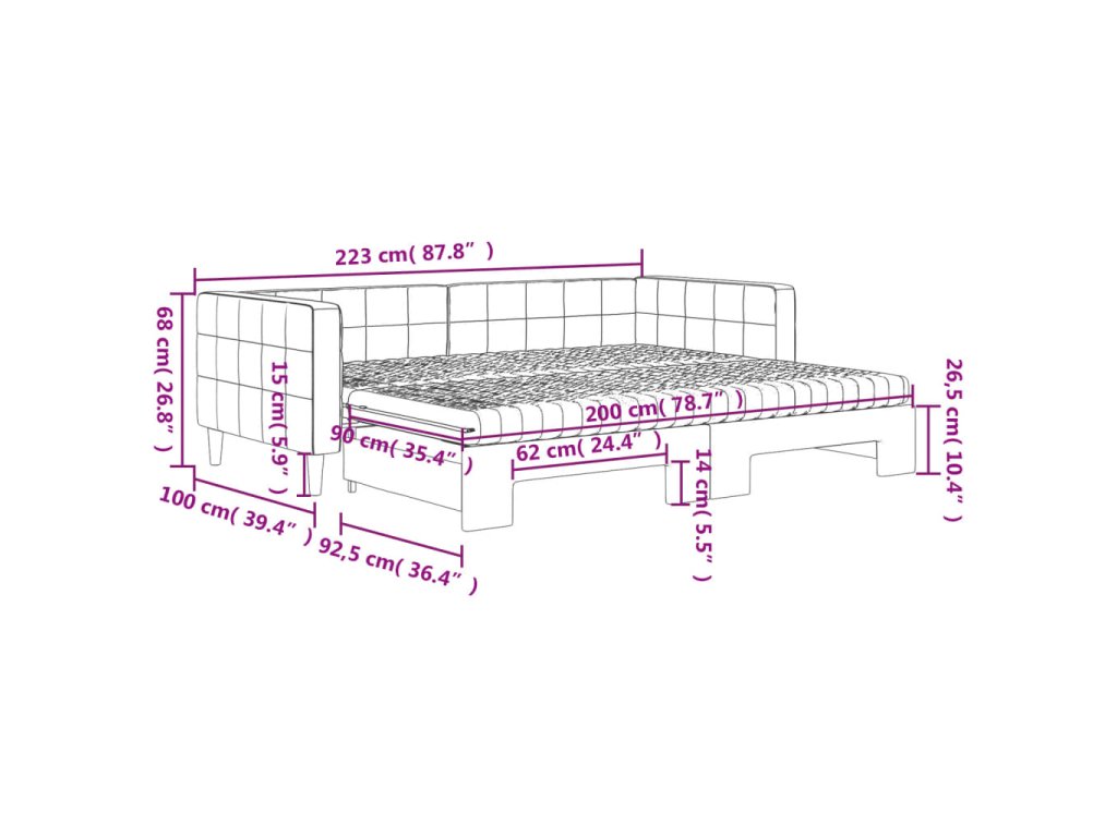 - Rozměry (nevysunuté): 223 x 100 x 68 cm (D x Š x V)