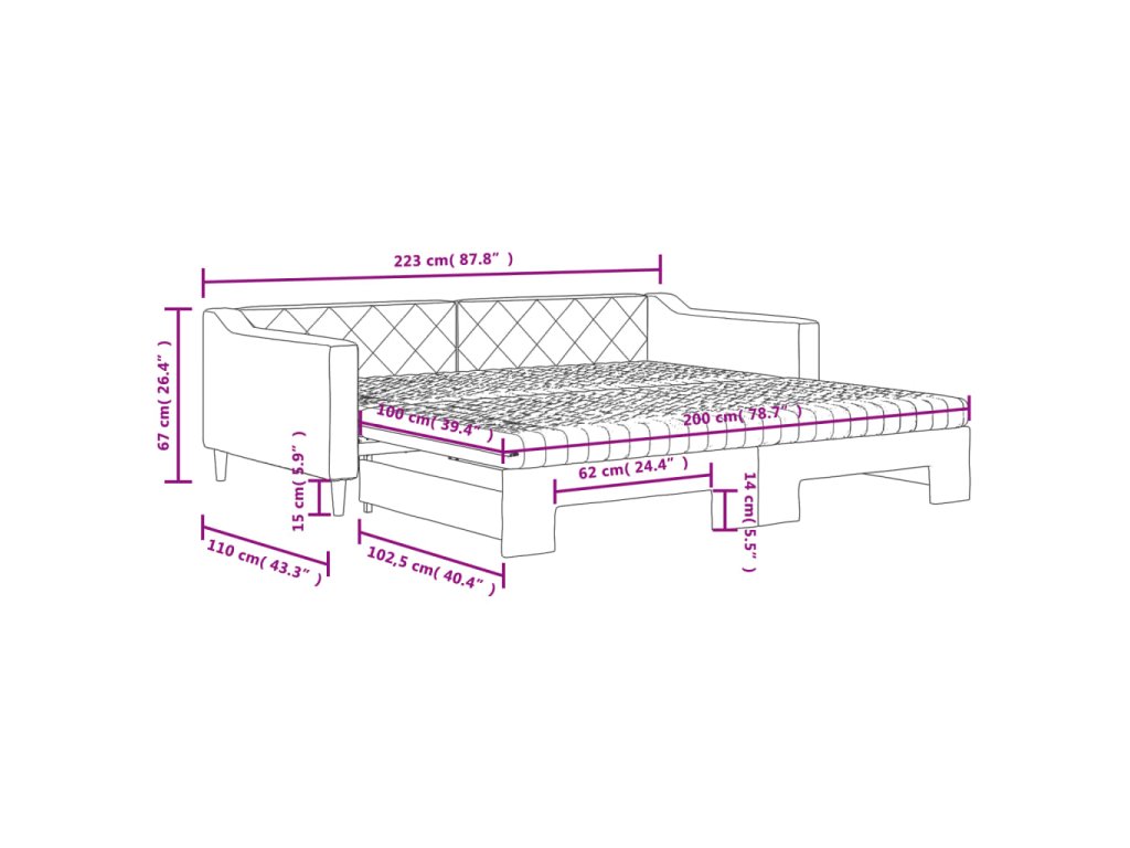 - Rozměry (nevysunuté): 223 x 110 x 67 cm (D x Š x V)