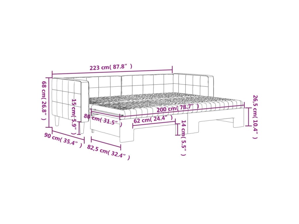 - Rozměry (nevysunuté): 223 x 90 x 68 cm (D x Š x V)