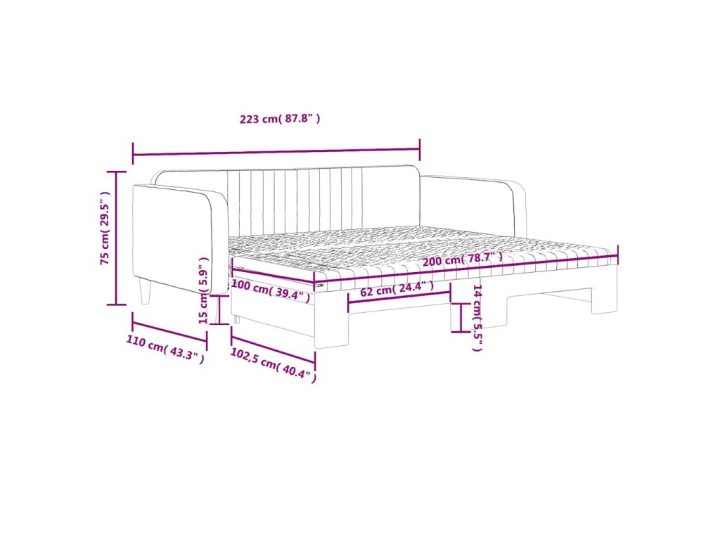- Rozměry (nevysunuté): 223 x 110 x 75 cm (D x Š x V)