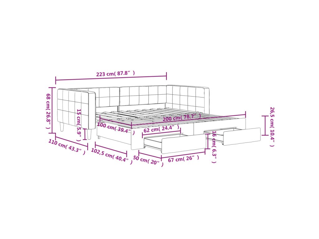 - Rozměry (nevysunuté): 223 x 110 x 68 cm (D x Š x V)