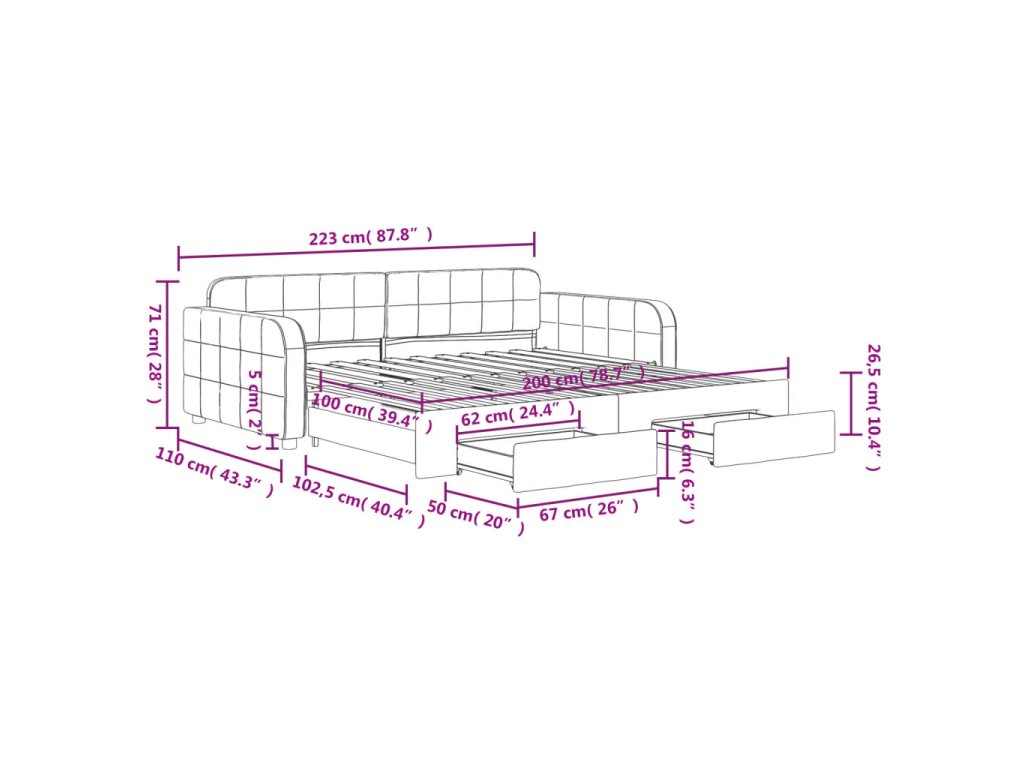 - Rozměry (nevysunuté): 223 x 110 x 71 cm (D x Š x V)