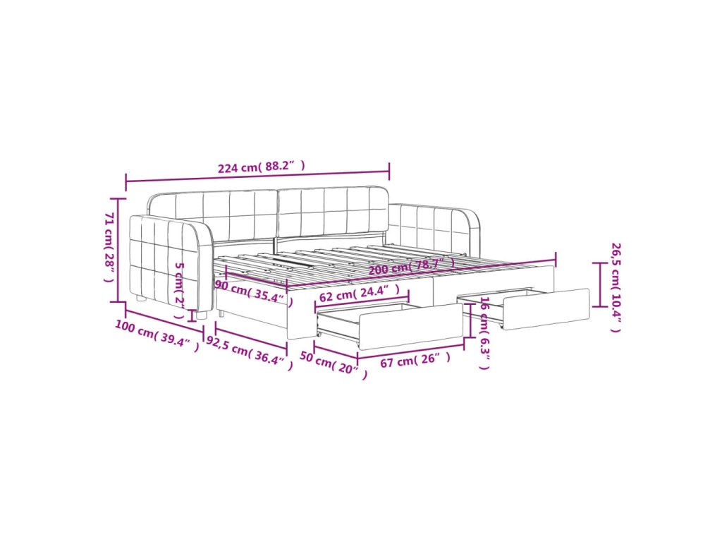 - Rozměry (nevysunuté): 224 x 100 x 71 cm (D x Š x V)