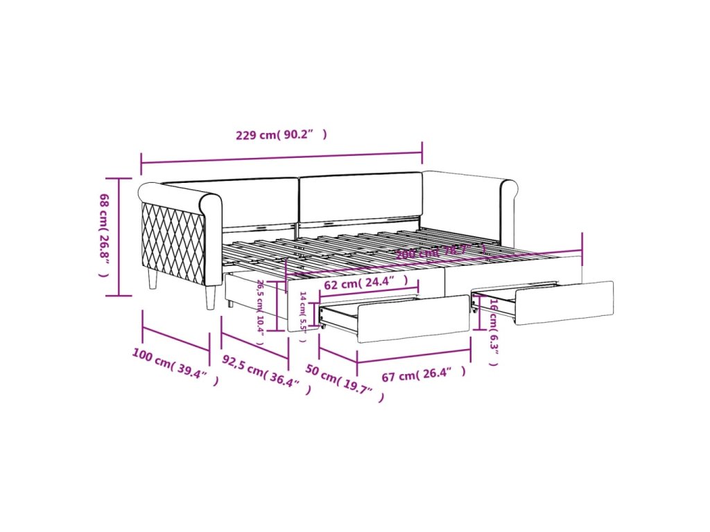 - Rozměry (nevysunuté): 229 x 100 x 68 cm (D x Š x V)