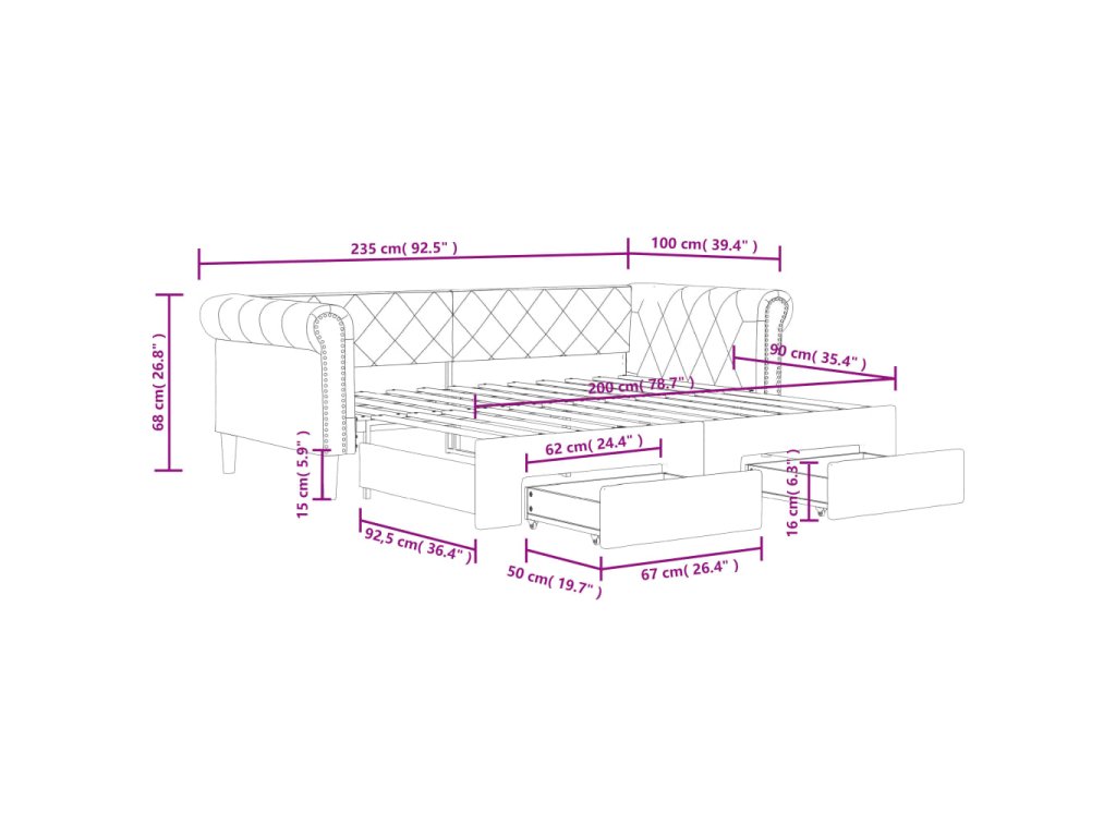 - Rozměry (nevysunuté): 235 x 100 x 68 cm (D x Š x V)