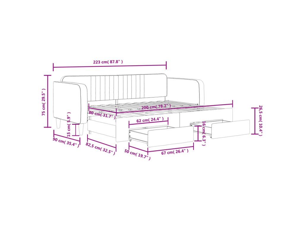 - Rozměry (nevysunuté): 223 x 90 x 75 cm (D x Š x V)
