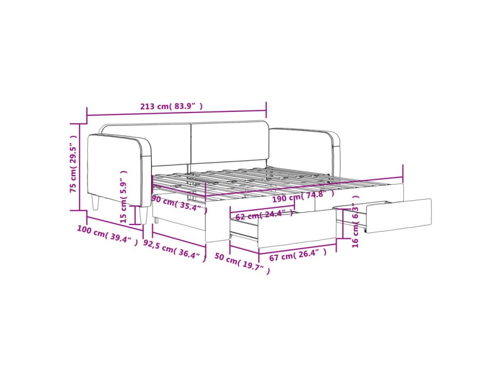 - Rozměry (nevysunuté): 213 x 100 x 75 cm (D x Š x V)