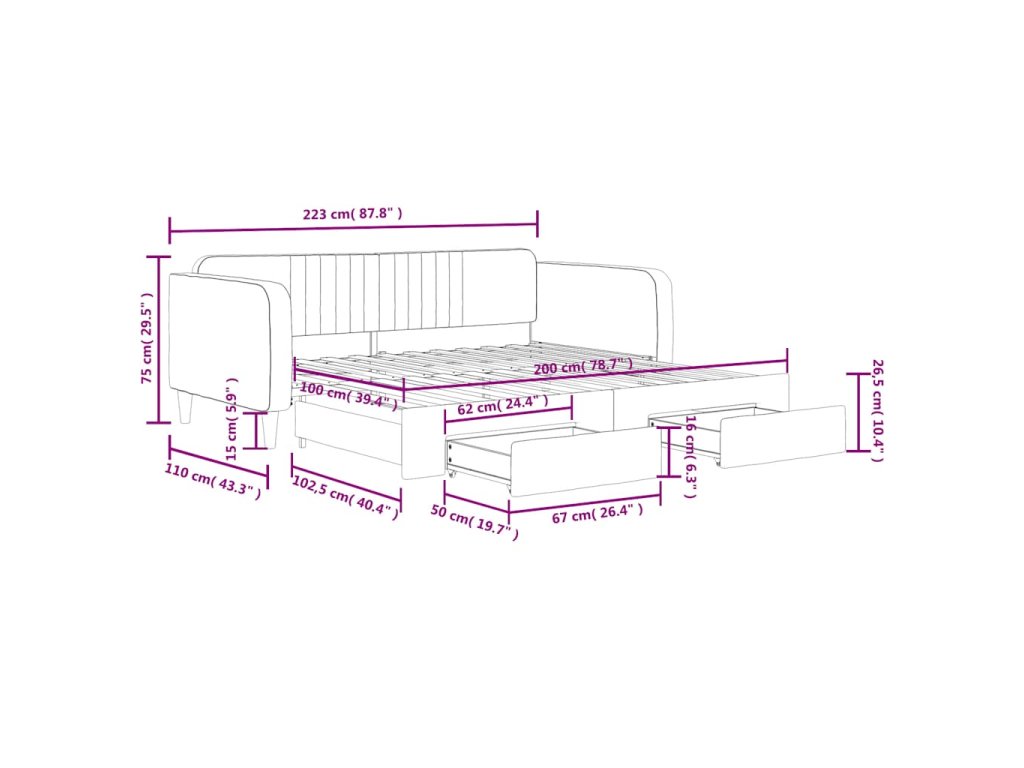 - Rozměry (nevysunuté): 223 x 110 x 75 cm (D x Š x V)
