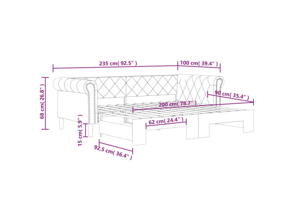 - Rozměry (nevysunuté): 235 x 100 x 68 cm (D x Š x V)