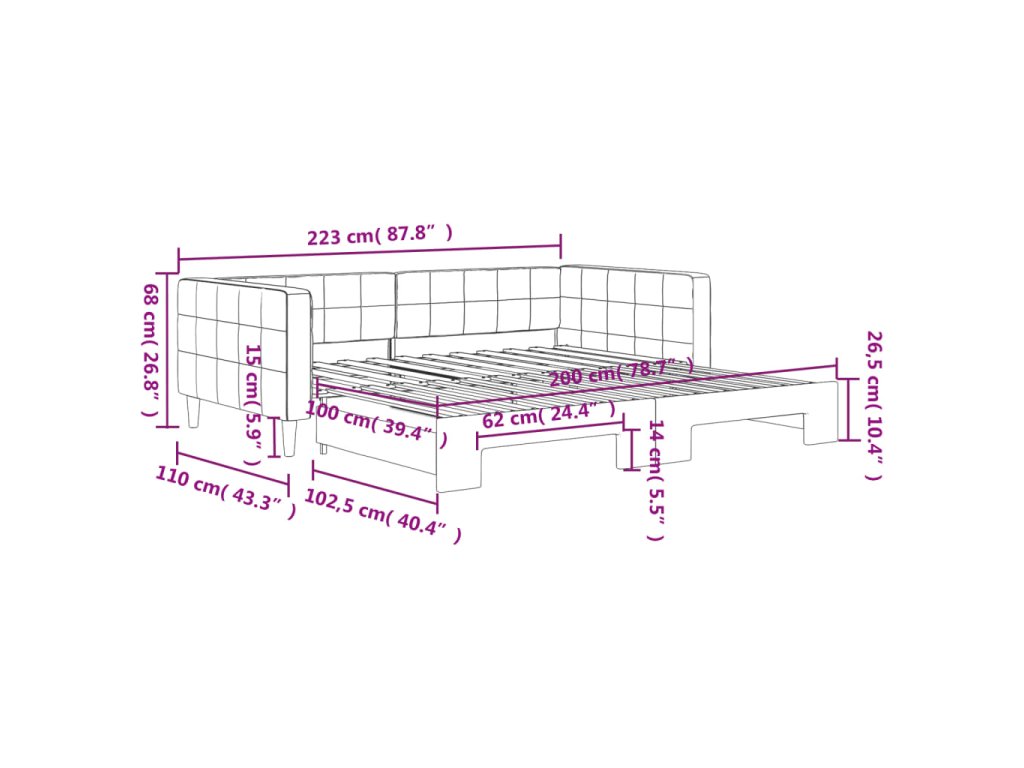- Všestranná válenda: Rozkládací pohovku lze během dne používat jako pohovku a v noci ji přeměníte na dvoulůžko pomocí přistýlky, kterou snadno vysunete, takže představuje pohodlné řešení pro uložení vašich hostů a zároveň maximálně využívá prostor.