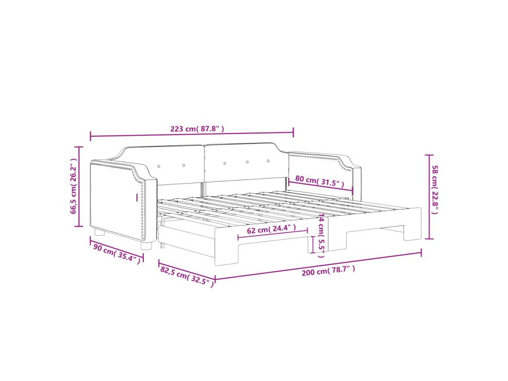 - Rozměry (nevysunuté): 223 x 90 x 66,5 cm (D x Š x V)