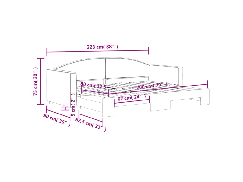 - Rozměry (nevysunuté): 223 x 90 x 75 cm (Š x H x V)