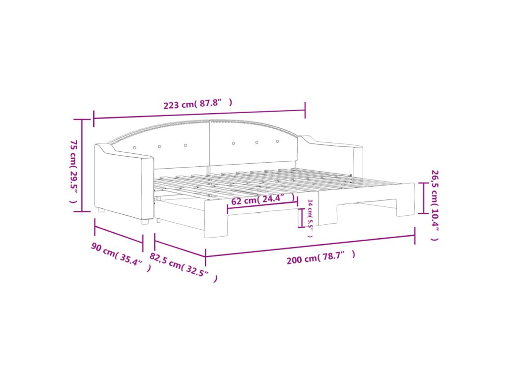 - Rozměry (nevysunuté): 223 x 90 x 75 cm (D x Š x V)