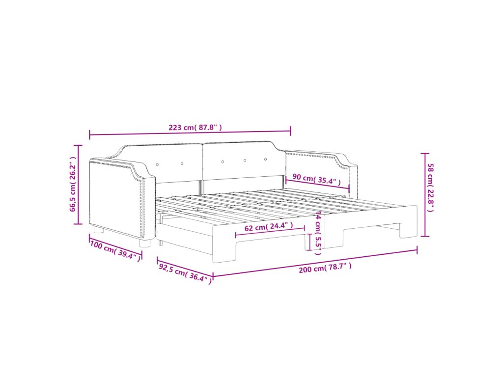 - Rozměry (nevysunuté): 223 x 100 x 66,5 cm (D x Š x V)