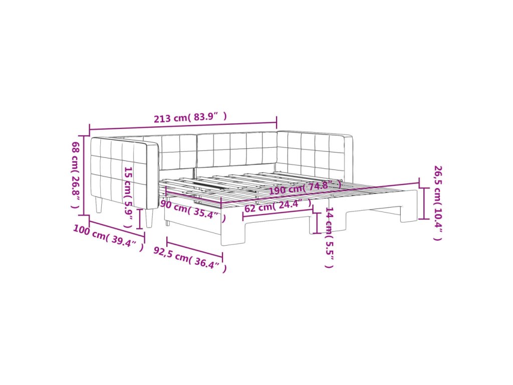 - Rozměry (nevysunuté): 213 x 100 x 68 cm (D x Š x V)