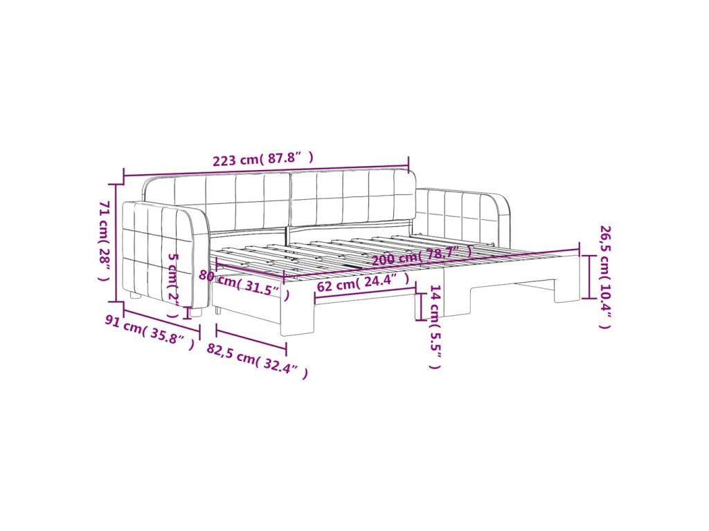 - Rozměry (nevysunuté): 223 x 91 x 71 cm (D x Š x V)