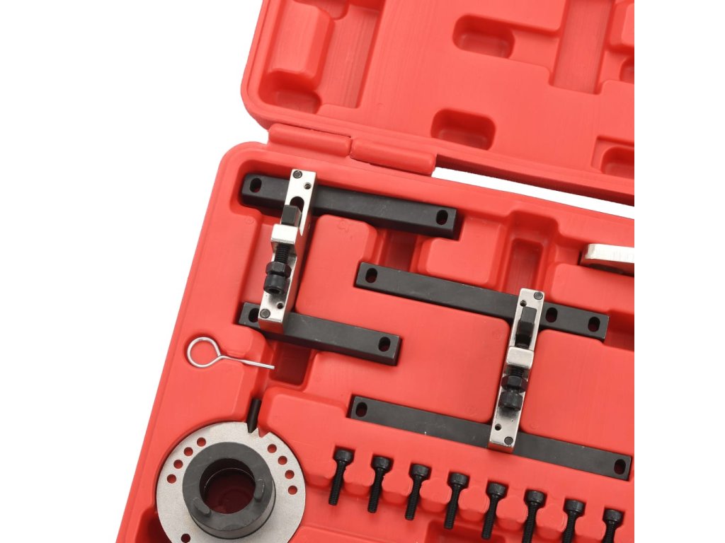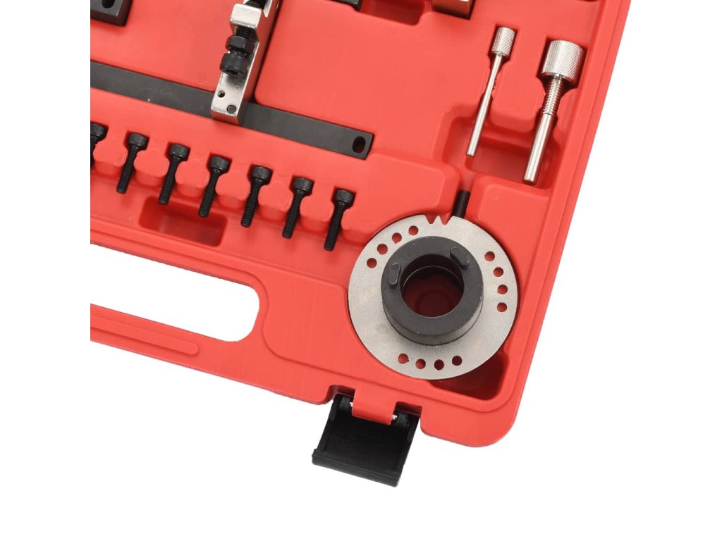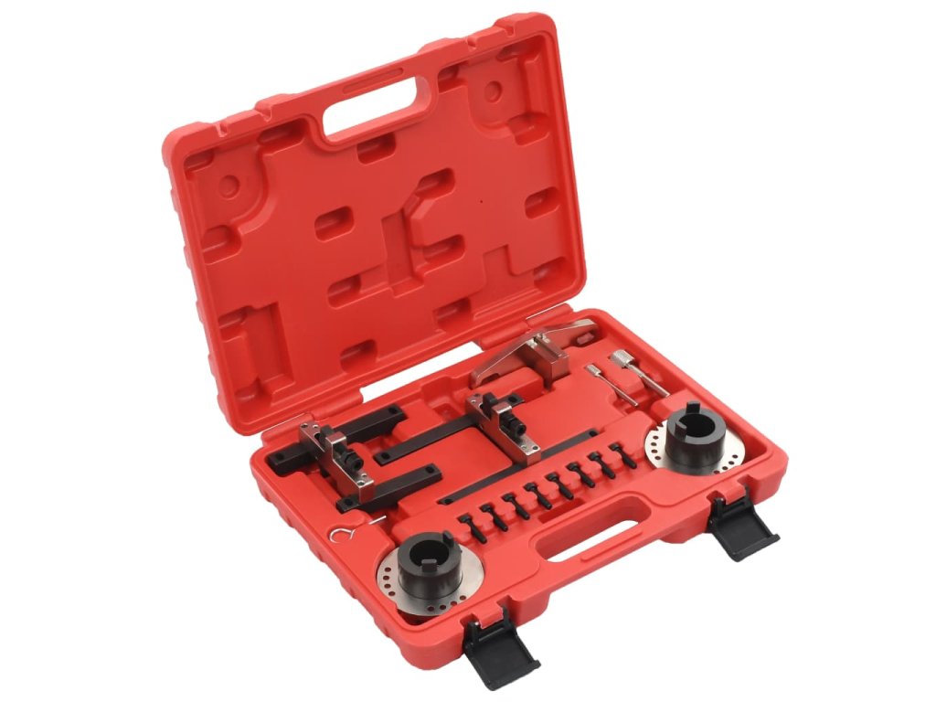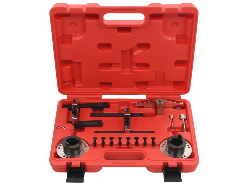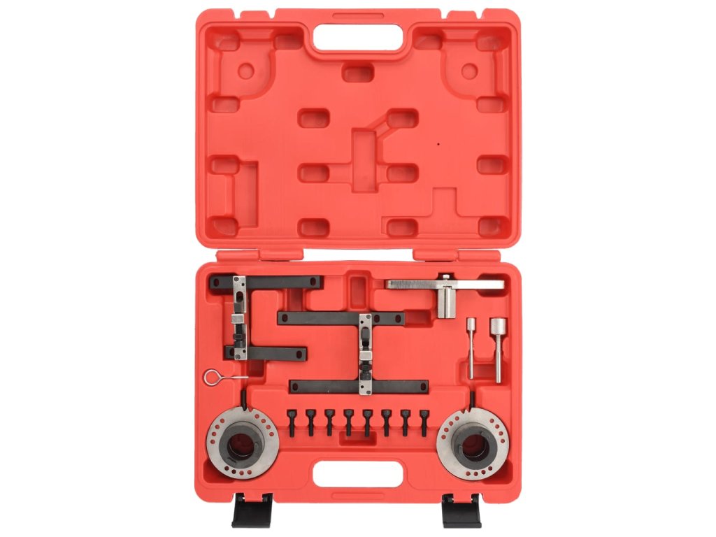 Pro obnovu a uvolnění tlumiče vibrací musíte nástroj upravit, připevnit ho k vačkovým hřídelím a pak jej zatlačit a zajistit v nulové poloze. Nástroje jsou vyrobeny z vysoce odolného ocelového materiálu, takže jsou nesmírně pevné a odolné a vydrží dlouhé roky používání. Všechny díly jsou uspořádány v praktickém pouzdře z foukaného plastu pro snadné skladování a přepravu.