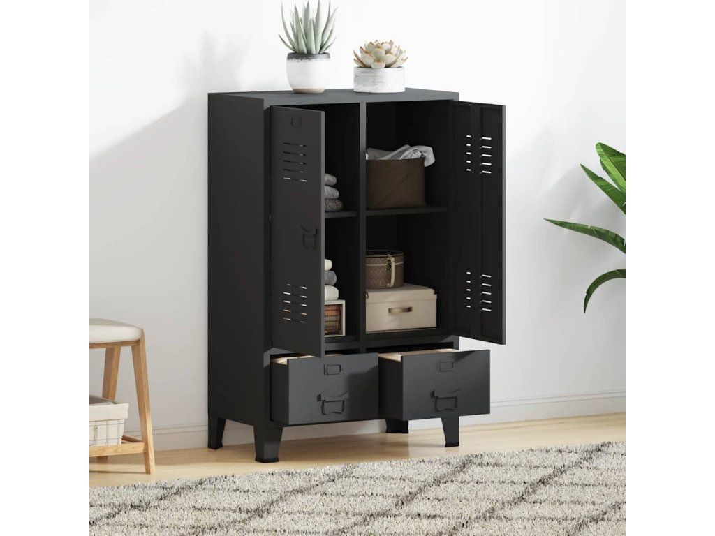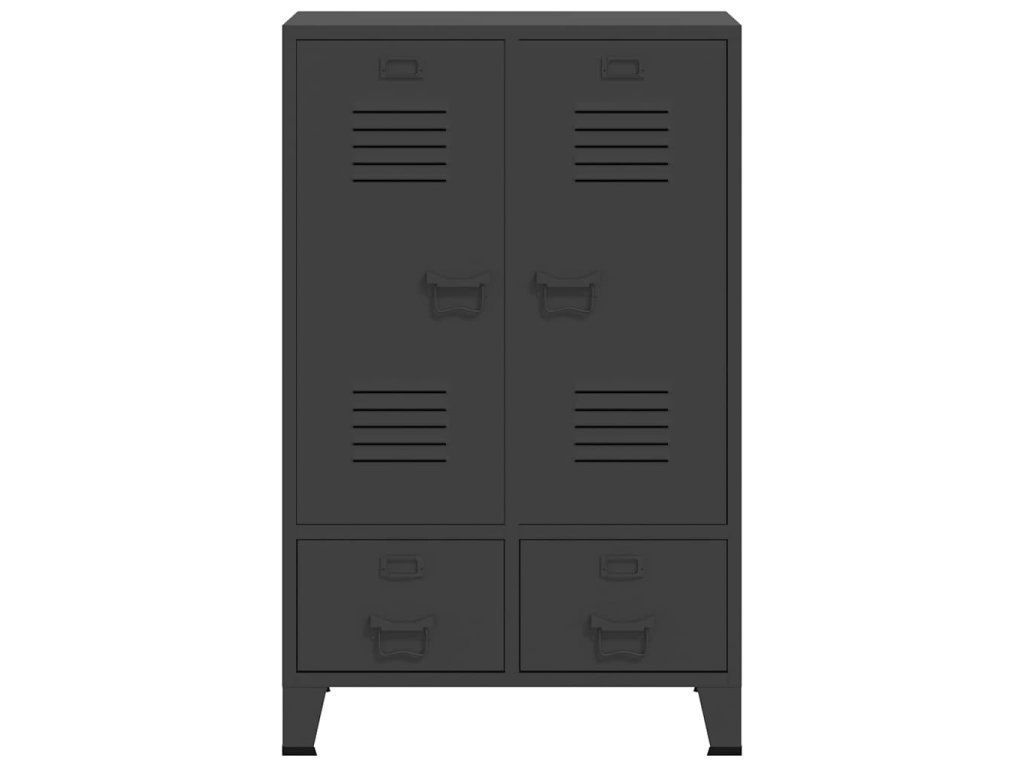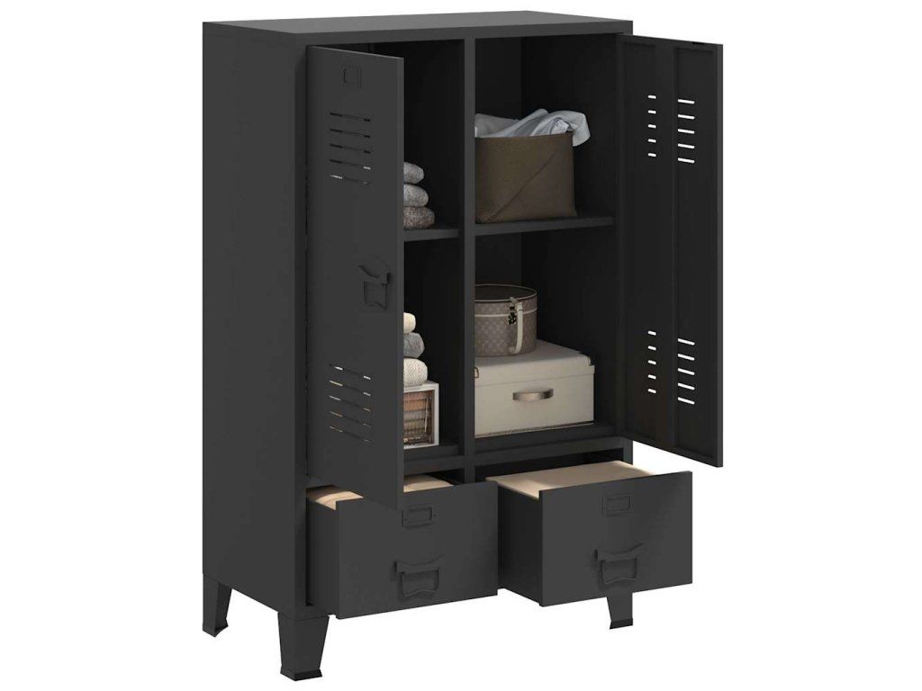 Skříň je vyrobená z oceli, takže je odolná a snadno se čistí. Uvnitř najdete 2 nastavitelné police, abyste si mohli oblečení roztřídit do různých kategorií, a 2 zásuvky pro přehledné uložení vašich ponožek, spodního prádla apod. Zásuvky se pohybují na dvoudílných pojezdech s kuličkovými ložisky, což zaručuje plynulé otevírání a zavírání, a to i s vyšší záteží (zásuvky lze zcela vysunout). Na každých dvířkách je držák na jmenovku a větrací otvory, které podtrhují celkový industriální vzhled skříně.