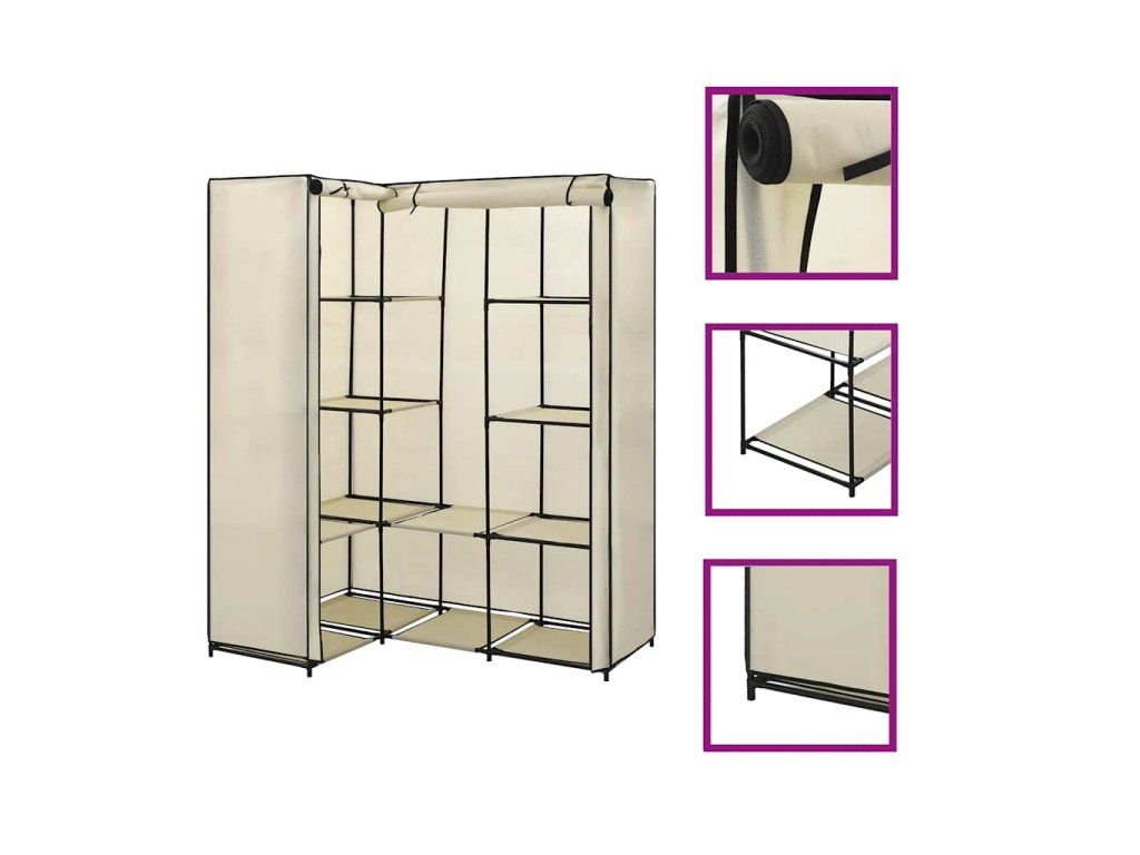 Tento stojan na oblečení s robustním železným rámem je mimořádně odolný. Ve srovnání s běžnou látkovou skříní je konstrukce rohové látkové skříně ještě stabilnější. Její design také šetří místo a umožňuje využít roh místnosti a vytvořit zde úložný prostor s tyčemi pro zavěšení, kde si můžete uspořádat vaše tašky, boty a malé předměty na dosah ruky. Textilní potah se zipy chrání vaše oblečení před nečistotami a prachem.