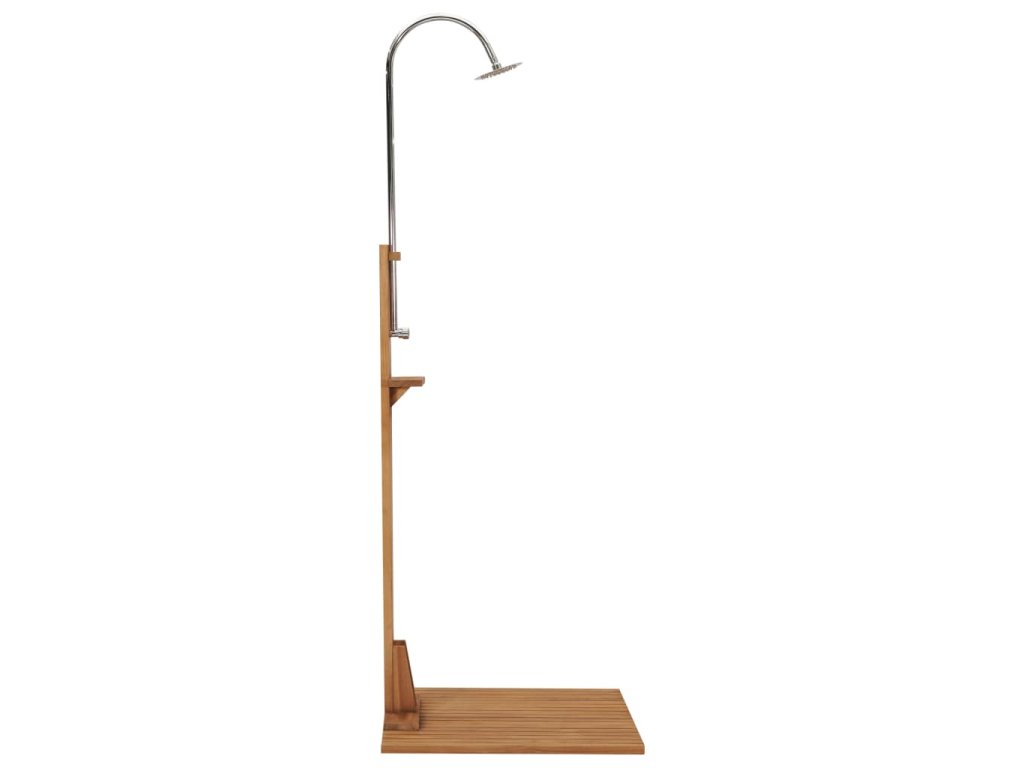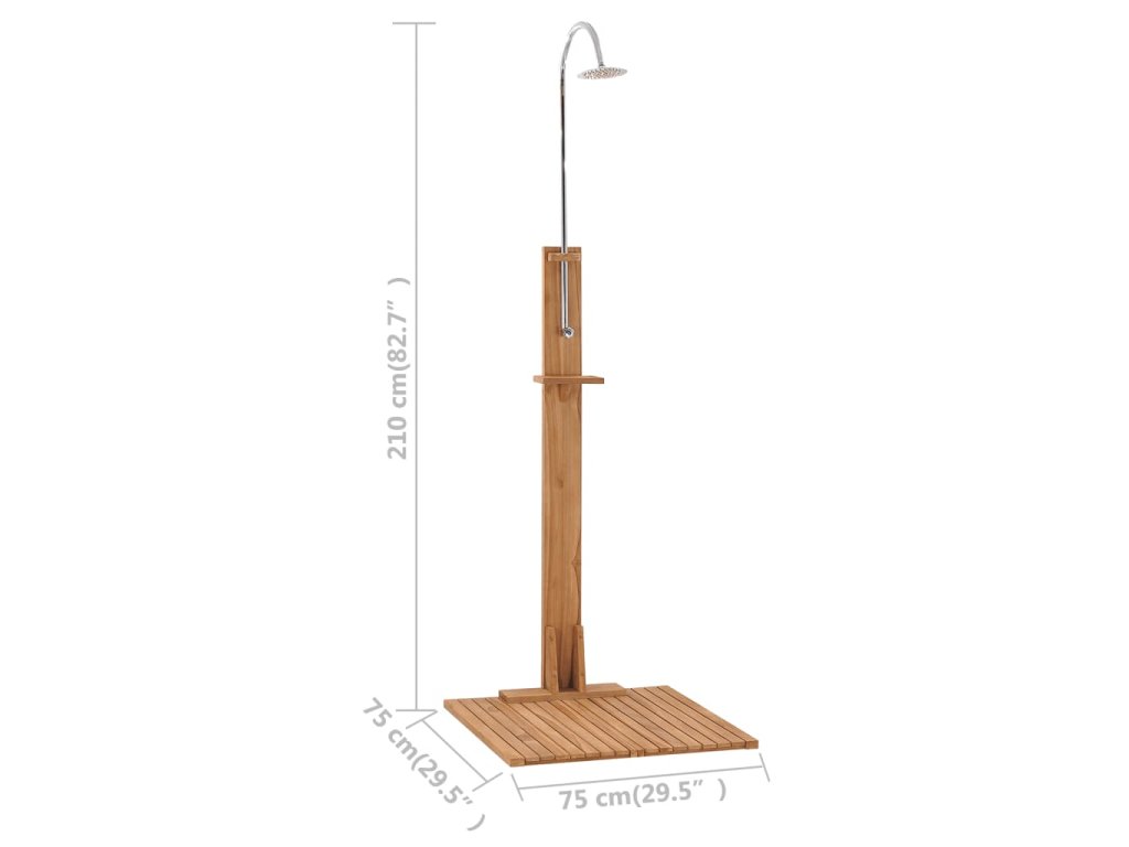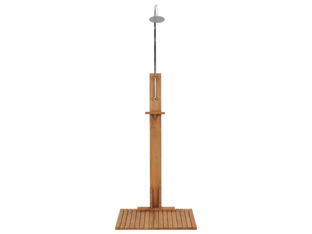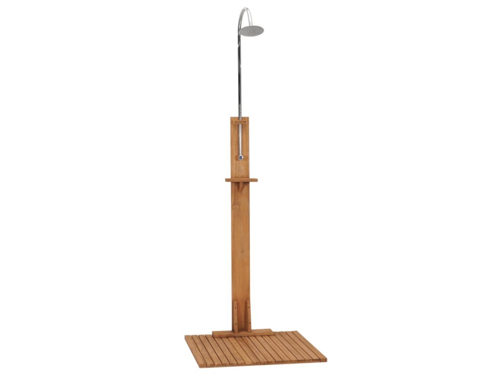 Zahradní sprcha je vyrobená z extrémně odolného teakového tvrdého dřeva, které je už vysušené, vyzrálé a jemně dohladka obroušené. Teakové dřevo je známé svou výjimečnou pevností a klimatickou odolností, takže je mnohem vhodnější pro zahradní nábytek a doplňky než jakýkoli jiný druh dřeva. Teakové dřevo je perfektní volba, pokud si chcete pořídit zahradní nábytek s dlouhou životností. Trubka je vyrobená z nerezové oceli, a proto je robustní a snadno se čistí. Zahradní sprcha, vybavená otočným knoflíkem a sprchovou hlavicí v ideální výšce, se snadno používá. Sprchový systém má širokou protiskluzovou základnu, takže je stabilní a poskytuje bezpečné místo pro sprchování. A své mýdlo a další sprchové potřeby si můžete uložit na poličku.