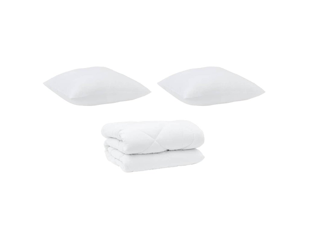 - Pečlivě zpracované komponenty Set obsahuje přikrývku a dva polštáře, každý naplněný polyesterovým vláknem. Tento lehký, ale hřejivý materiál tě zahřeje během celé noci. Polštáře, prošívané pro texturu a teplo, zvyšují pohodlí, takže tvoje postel se promění v útulnou svatyni.