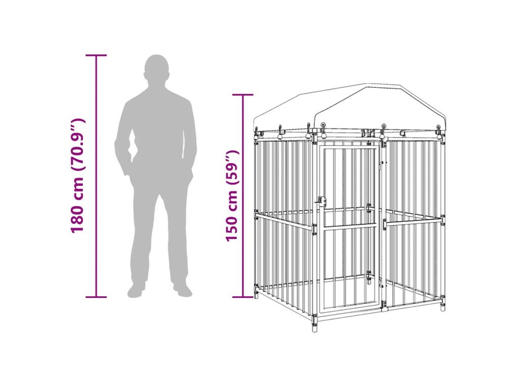 Tato velká psí bouda poskytuje dostatek prostoru pro cvičení, zatímco ocelové tyčové stěny pomáhají předcházet neplechám a neočekávaným nehodám a zároveň umožňují větrání. Díky robustní a odolné ocelové konstrukci je tato psí bouda odolná a vyrobená pro dlouhou životnost. Součástí dodávky je ohnivzdorná a UV chráněná střecha ze 100% polyethylenu a chrání před sluncem, deštěm, sněhem a dalšími nepříznivými povětrnostními podmínkami. Dveře s panty mají uzamykatelný západkový systém, který zajišťuje vašim psům extra bezpečnost a ochranu.