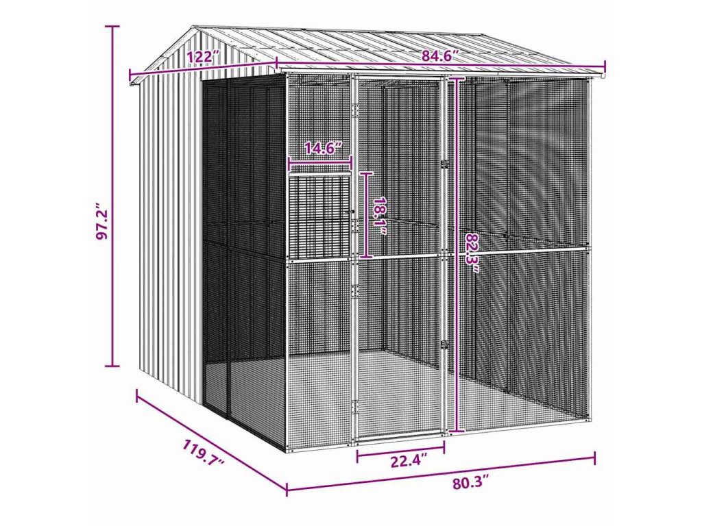 - Materiály: Vyrobená z kvalitní pozinkované oceli, tahle voliéra vydrží i drsné počasí a její lesklý vzhled zůstává. UV odolná konstrukce zajišťuje, že je bezpečná pro ptáky i na přímém slunci.