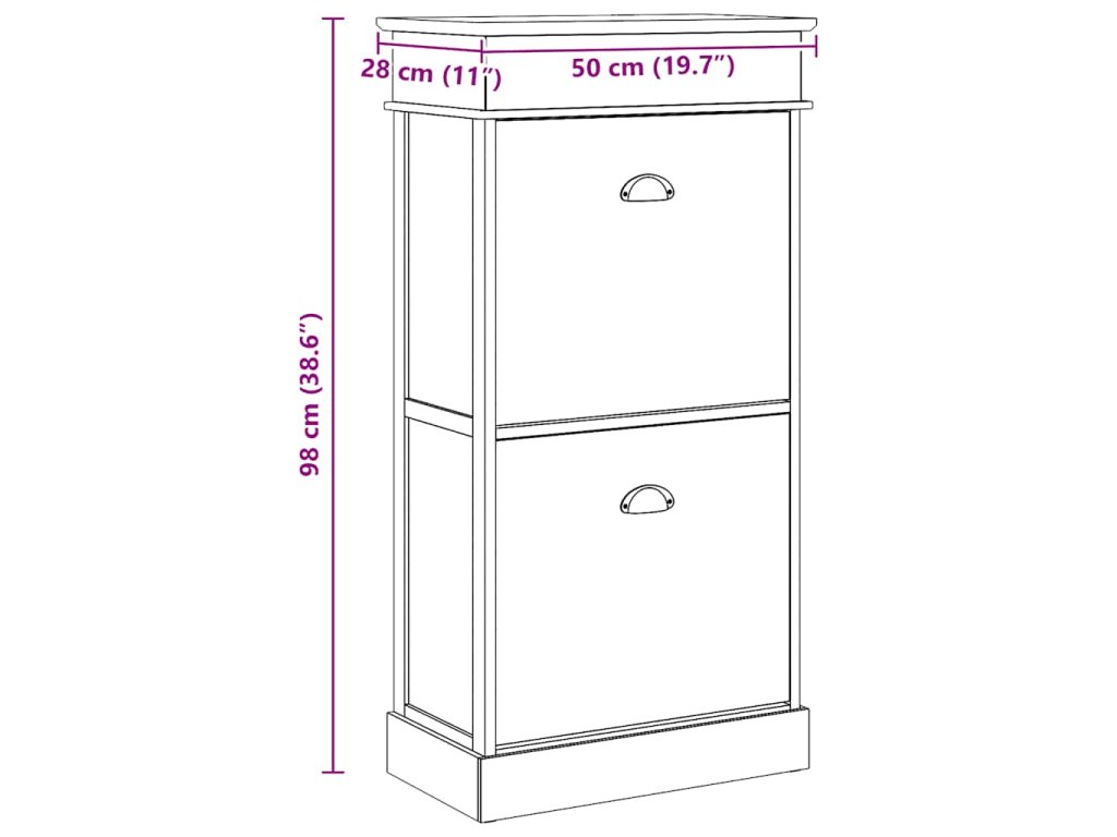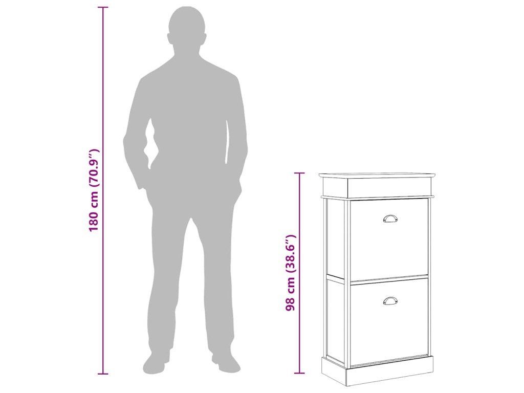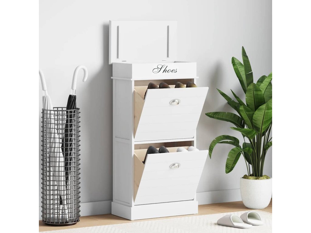 Skříňka je vyrobena ze dřeva pavlovnie, je tedy mimořádně odolná a stabilní. Dvě velké vyklápěcí přihrádky jsou opatřeny příčnými tyčemi, aby vše zůstalo na svém místě. Horní deska botníku se navíc dá odklopit, takže si do horní přihrádky můžete uschovat různé doplňky k obuvi, jako jsou tkaničky, vložky do bot a další maličkosti. Sestavení našeho botníku je snadné.