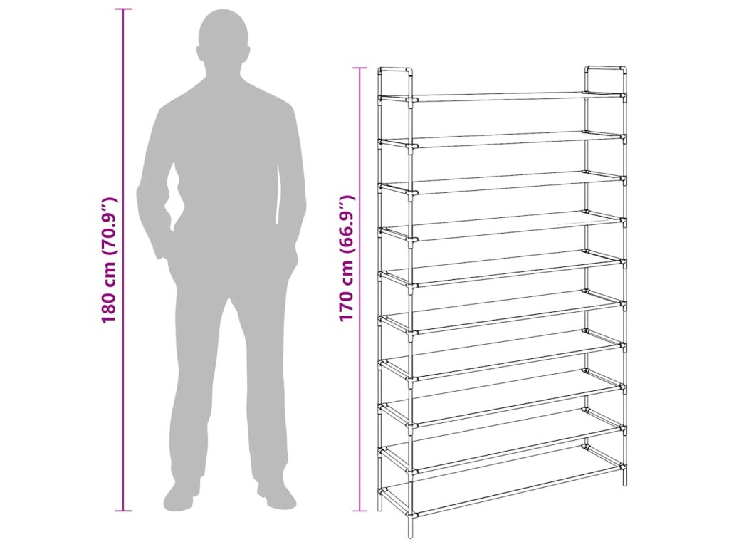 Má trubkový kovový rám, který je lehký, ale přitom robustní, lze jej tedy snadno přemisťovat a zároveň je i velmi stabilní. Má deset prostorných polic, vyrobených z netkané textilie, které vám poskytnou spoustu prostoru pro přehledné ukládání vašich bot tak, aby vám nepřekážely.
