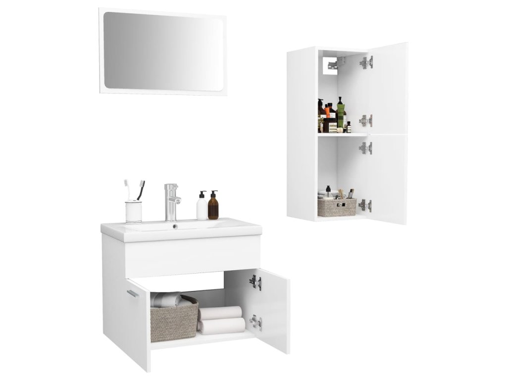 Sada nábytku obsahuje skříňku pod umyvadlo, malou skříňku a zrcadlo. Stylová umyvadlová skříňka má 1 přihrádku a nahoře je ideálně uzpůsobená k umístění umyvadla. V nízké skříňce najdete 2 přihrádky, které vám poskytnou spoustu místa k uložení vašich věcí. Zrcadlo zase dodá vaší domácnosti nový půvab. Celý set koupelnového nábytku snadno očistíte navlhčeným hadříkem.