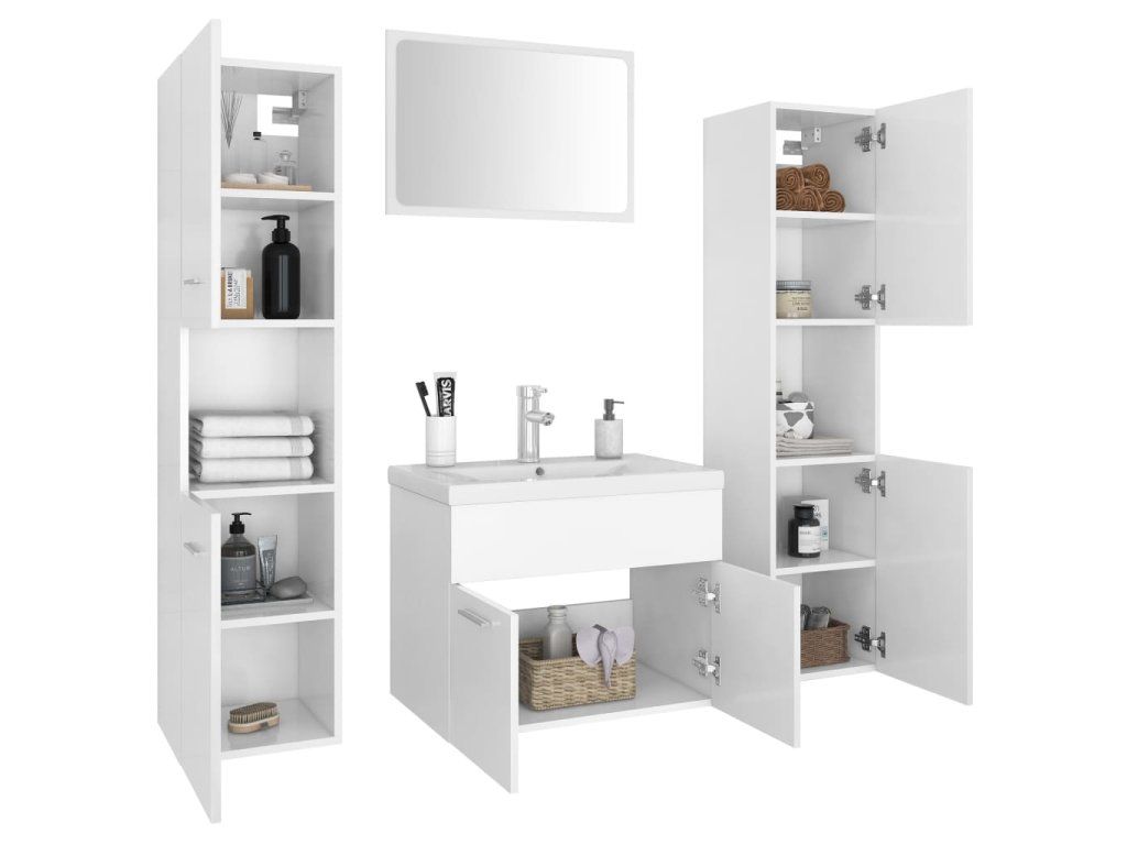 Sada nábytku obsahuje umyvadlovou skříňku s umyvadlem, 2 vysoké skříňky a zrcadlo. Stylová skříňka pod umyvadlo má 1 přihrádku, dokonale se hodí pod vaše umyvadlo a nabídne vám šikovné úložné řešení do koupelny. Keramické umyvadlo neslouží pouze jako hygienická nádoba pro každodenní použití – hraje také významnou dekorativní roli. Svým trendovým a moderním designem navíc krásně doplní každý styl zařízení. Umyvadlo je vybavené přepadem, který umožňuje odtékání vody v případě, že se umyvadlo příliš přeplní. V každé z vysokých skříněk s dvěma dvířky se nachází celkem 5 přihrádek, poskytnou vám tedy spoustu místa k uložení vašich věcí. Zrcadlo zase přidá vaší domácnosti na půvabu. Celý set koupelnového nábytku lze snadno očistit navlhčeným hadříkem.