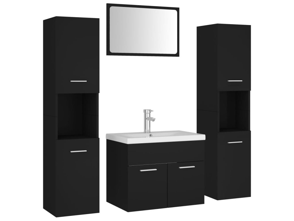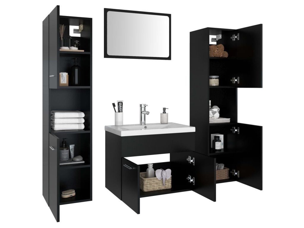 Set nábytku obsahuje skříňku pod umyvadlo, 2 vysoké skříně, zápustné umyvadlo a zrcadlo. Stylová skříňka pod umyvadlo má 1 přihrádku a shora je ideálně uzpůsobená k umístění umyvadla. V každé z vysokých skříní s dvěma dvířky najdete celkem 5 přihrádek, které vám poskytnou spoustu místa k uklizení vašich koupelnových potřeb. Keramické umyvadlo neslouží jen jako praktická nádoba pro každodenní použití – hraje také významnou dekorativní roli. Vzhledem k jeho trendovému a modernímu designu zaručeně zapadne do každého stylu zařízení. Je vybavené také přepadem, který umožňuje odtok vody, pokud se umyvadlo příliš přeplní. Zrcadlo vám rovněž pomůže zkrášlit vaše bydlení. Celou soupravu nábytku lze navíc snadno čistit navlhčeným hadříkem.