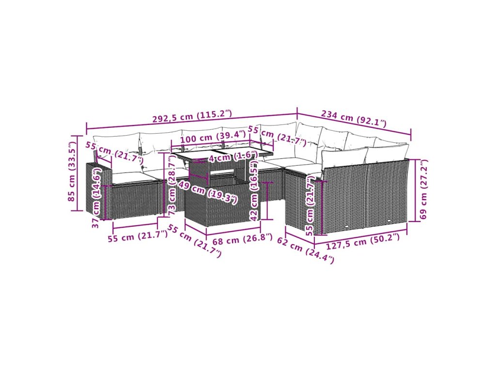 Tato zahradní sedací souprava je dokonalým doplňkem vaší zahrady, terasy nebo dvorku a poskytne vám pohodlné a příjemné místo, kde si můžete povídat s rodinou a přáteli nebo jen tak odpočívat a užívat si pobyt venku.