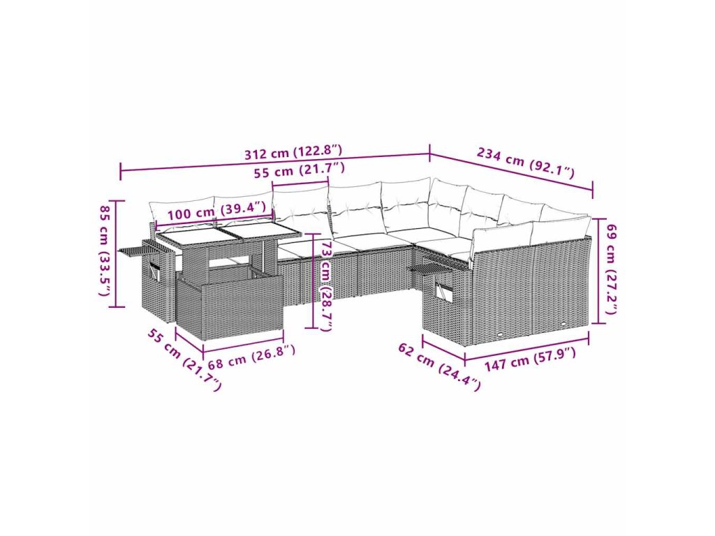 Tato zahradní sedací souprava je dokonalým doplňkem vaší zahrady, terasy nebo dvorku a poskytne vám pohodlné a příjemné místo, kde si můžete povídat s rodinou a přáteli nebo jen tak odpočívat a užívat si pobyt venku.