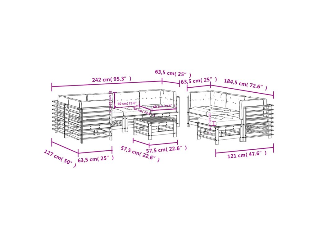 - Rozměry středové pohovky: 57,5 x 63,5 x 60 cm (D x Š x V)