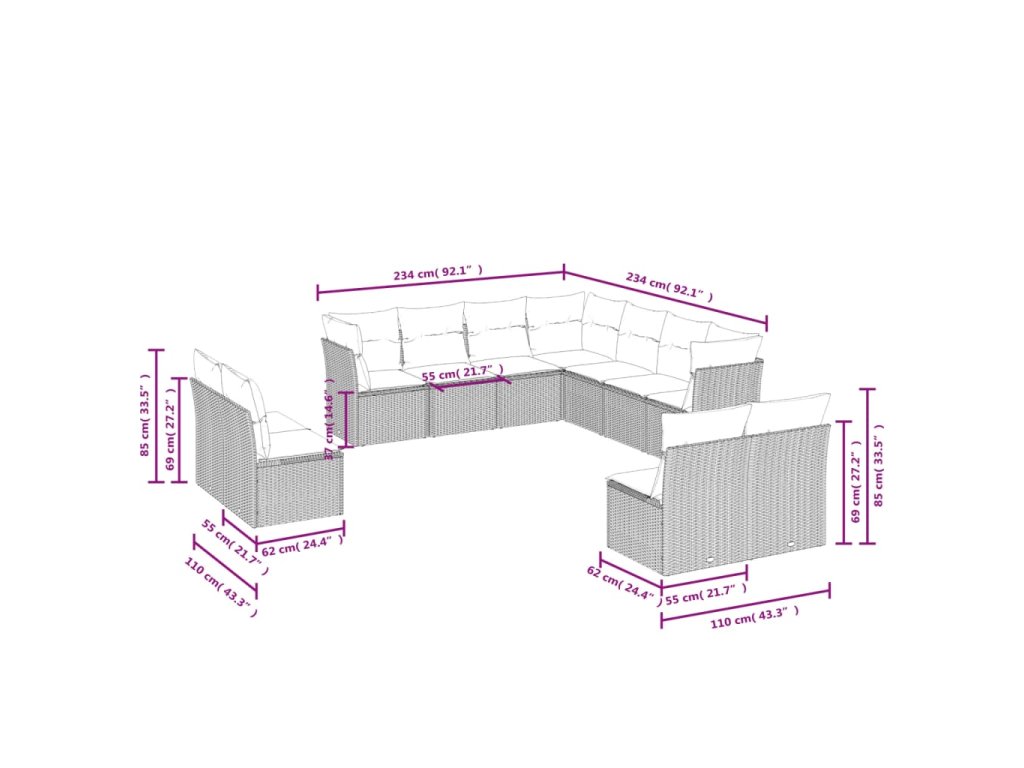 - Celkové rozměry 7místné pohovky: 234 x 234 x 69 cm (Š x H x V)