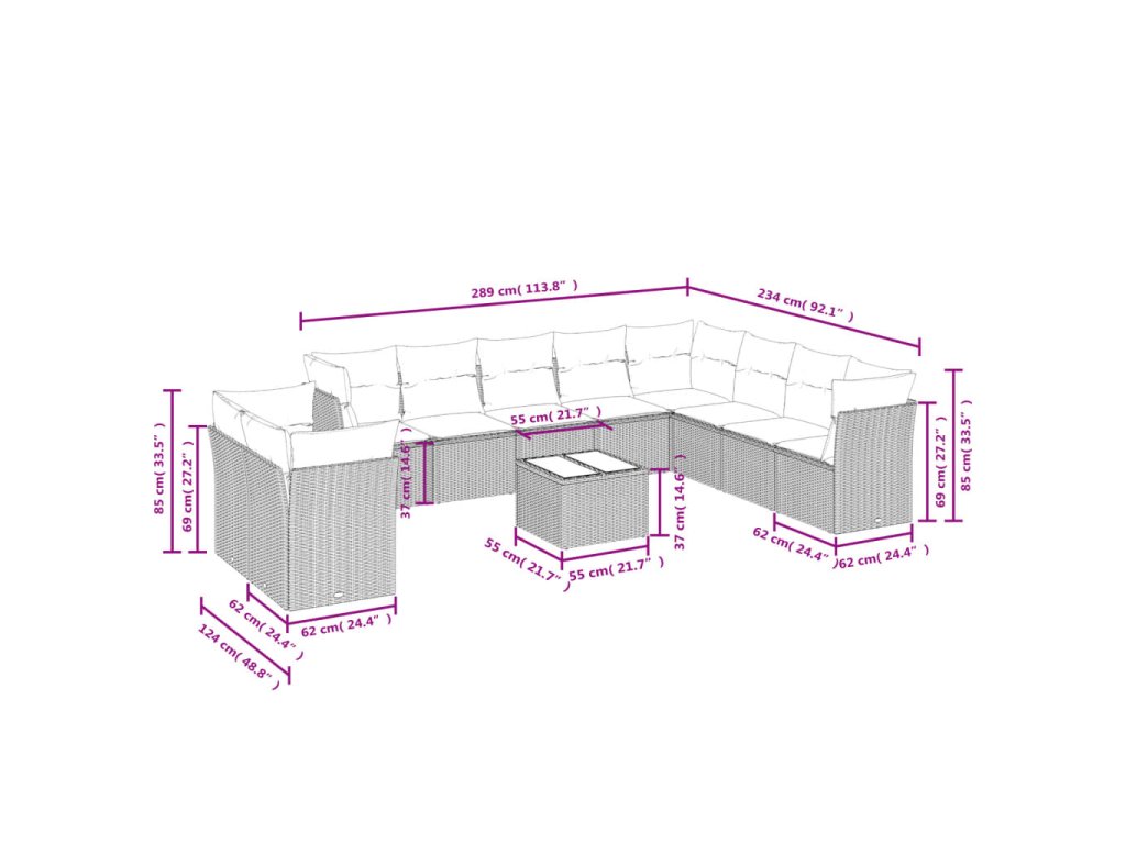 - Celkové rozměry 8místné pohovky: 289 x 234 x 69 cm (Š x H x V)