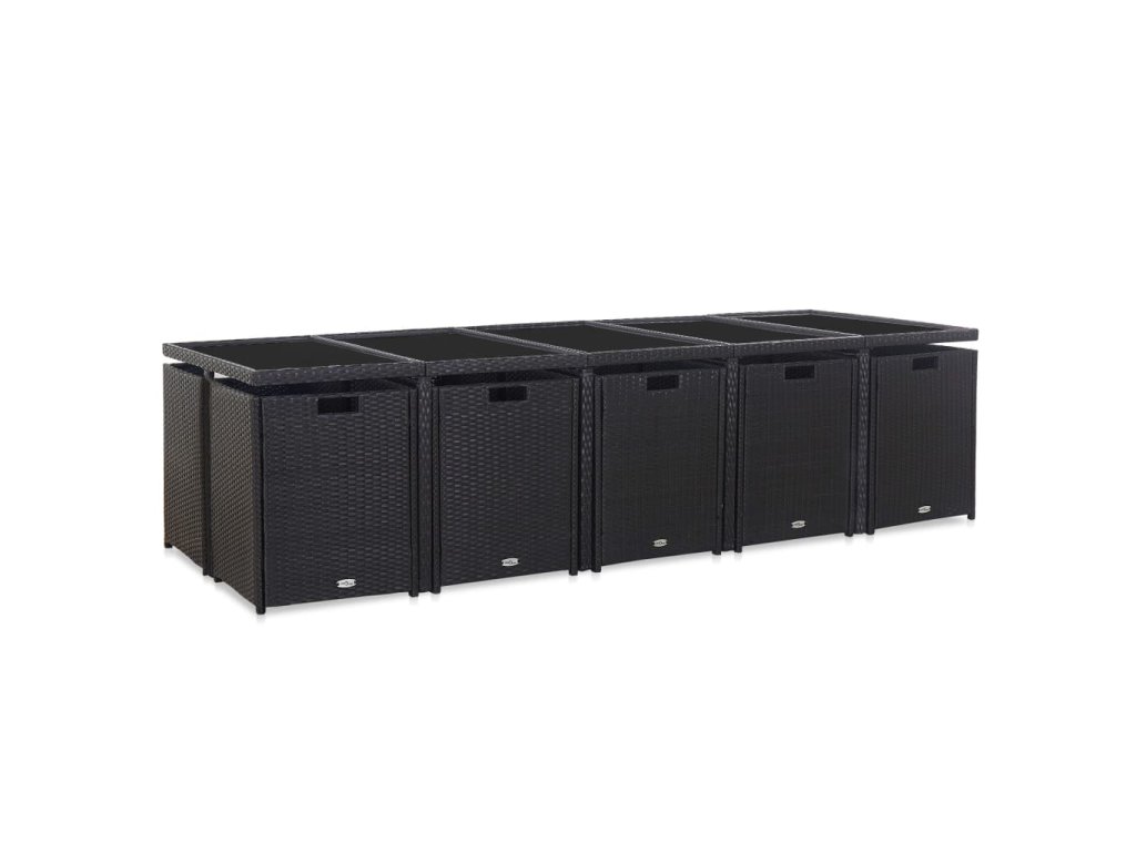 Balení obsahuje 1 stůl se skleněnou deskou, 10 ratanových židlí, 4 stoličky a 24 odnímatelných podušek.