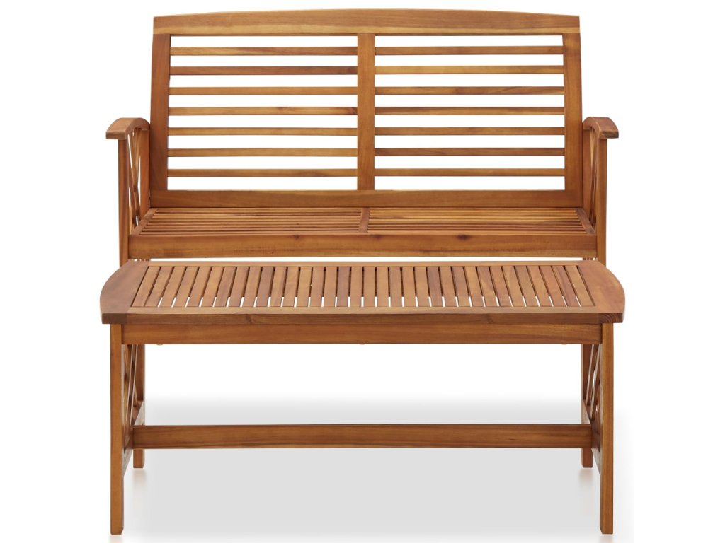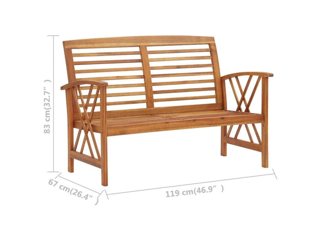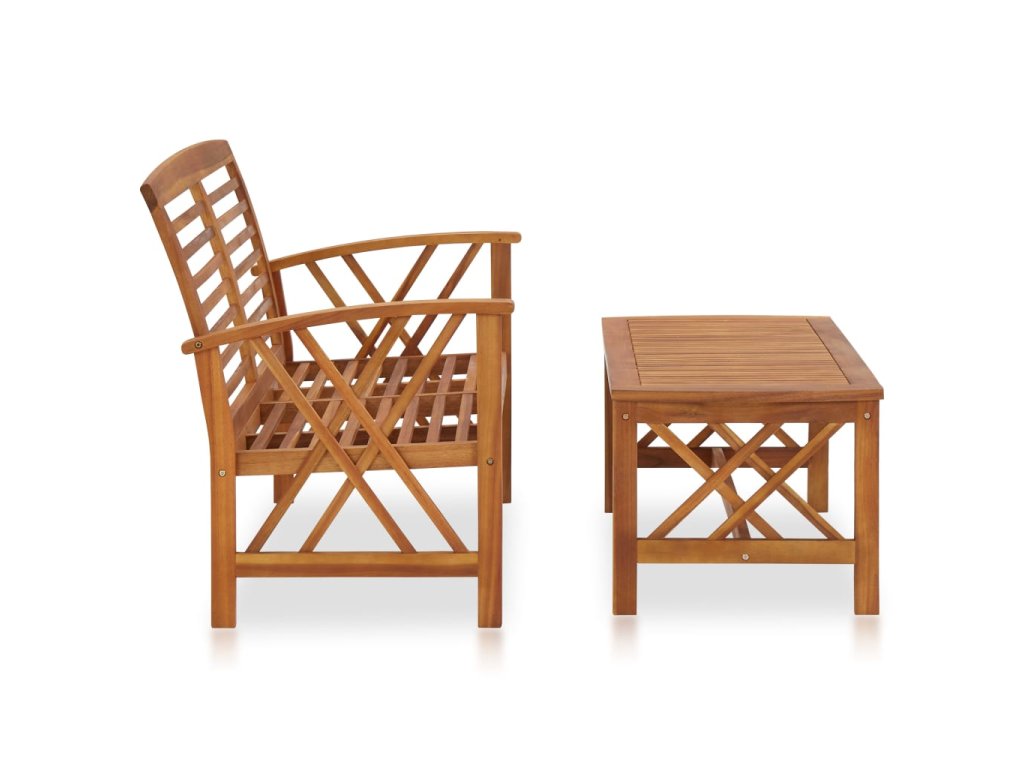 Set zahradního nábytku je zhotovený z masivního akáciového dřeva s olejovou úpravou, je stabilní a má dlouhou životnost. Konferenční stolek z masivní dřevěnou stolní deskou s lamelovým designem poslouží jako perfektní odkládací plocha pro vaše občerstvení, mísy s ovocem, dekorativní předměty a další nezbytnosti. Na lavičce s opěradlem a loketními opěrkami se velmi pohodlně sedí. Jak stolek, tak lavice mají dvojitý kříž na obou stranách.