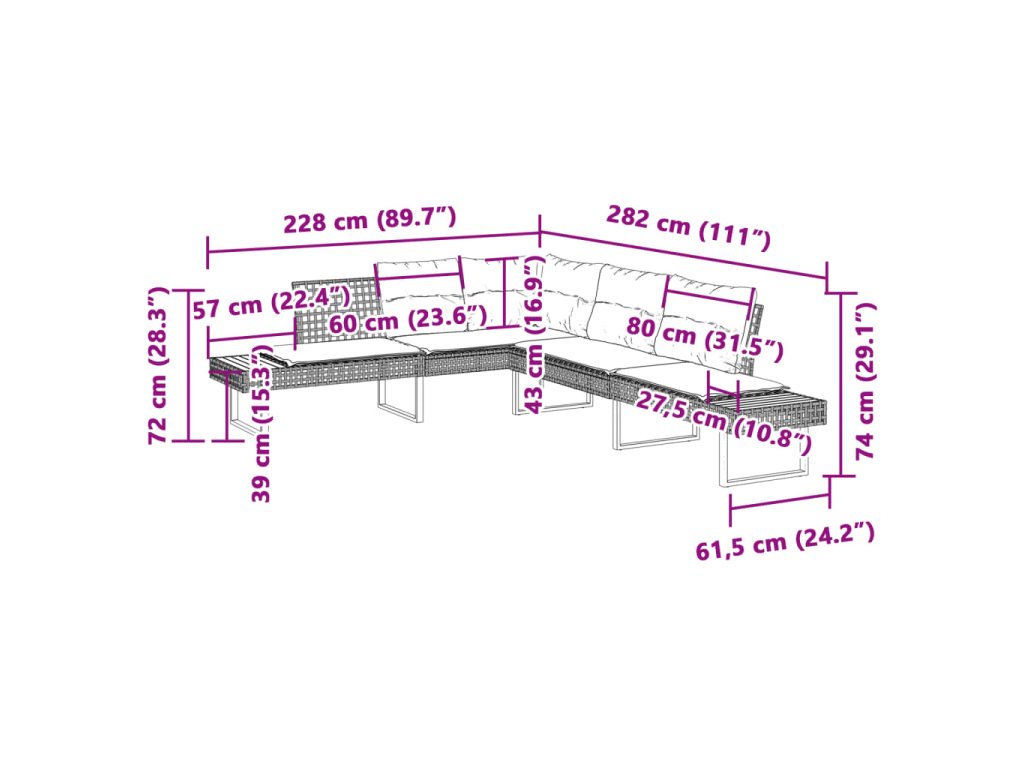 - Celkové rozměry: 282 x 228 x 74 cm (Š x H x V)