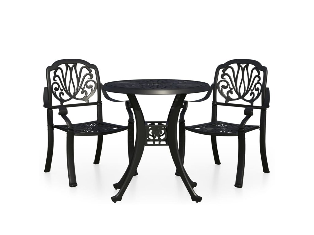 Zahradní stůl a židle z litého hliníku jsou robustní a hodně toho vydrží. Jelikož jsou vyrobené z materiálu, který nerezaví a nepodléhá klimatickým vlivům, jedná se o ideální nábytek pro venkovní použití. Vzhledem ke svému překrásnému designu zapůsobí bistro set ve vašem venkovním bydlení jako elegantní doplněk. Konferenční stolek má navíc uprostřed otvor, kam můžete zasunout slunečník, abyste se ochránili před sluníčkem či deštěm.