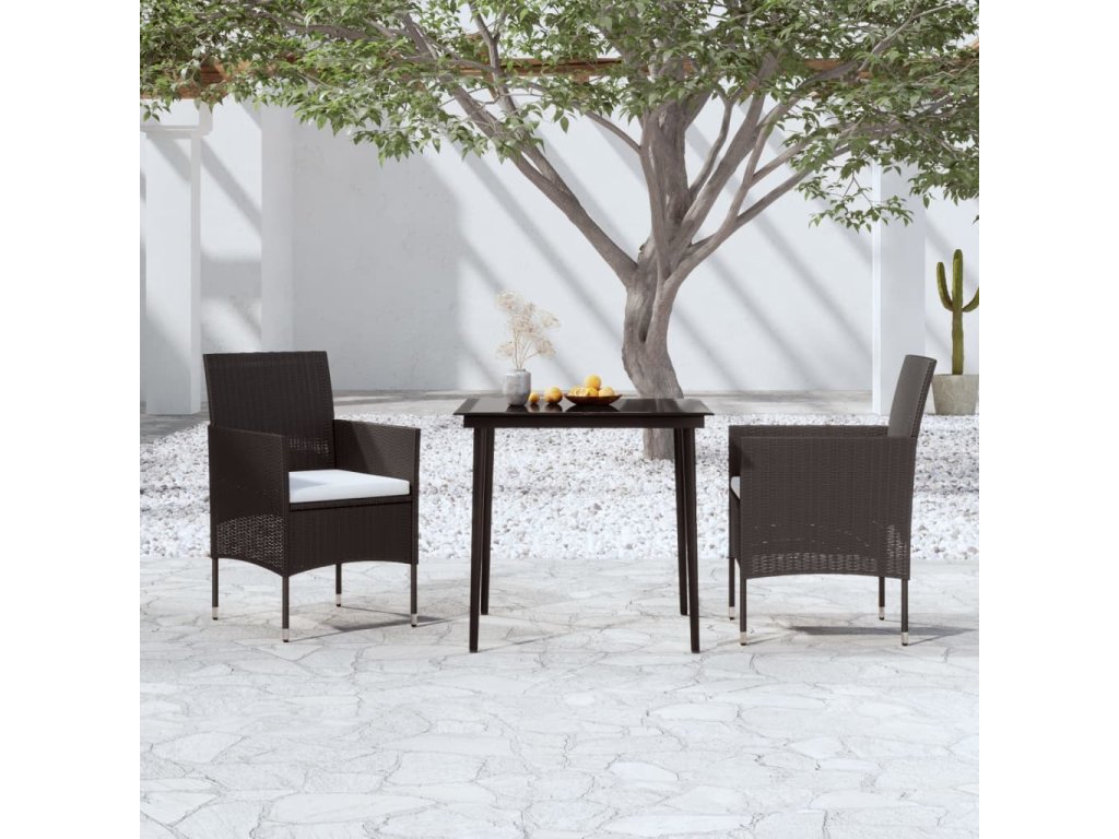 Stůl a židle mají rám z práškově lakované oceli, jsou tedy robustní, stabilní a skvěle se hodí pro každodenní venkovní použití. Židle jsou zhotoveny z voděodolného PE ratanu, takže se snadno čistí a můžete je klidně používat každý den. Hladkou skleněnou desku stolu jednoduše očistíte vlhkým hadříkem a výborně vám poslouží k servírování občerstvení a nápojů či k vystavení různých dekorativních předmětů.