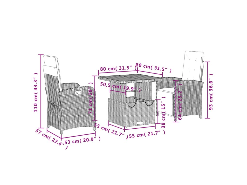 - Rozměry při poloze vsedě: 57 x 61 x 93 cm (Š x H x V)