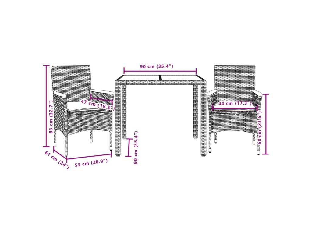 3dílný zahradní jídelní set s poduškami černý polyratan a sklo 3278645