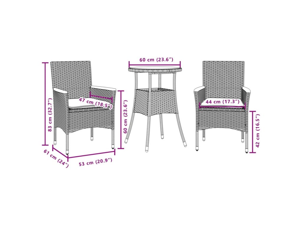 3dílný zahradní jídelní set s poduškami černý polyratan a sklo 3278721