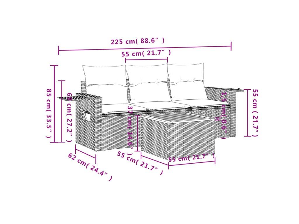 Tato zahradní sedací souprava je dokonalým doplňkem vaší zahrady, terasy nebo dvorku a poskytne vám pohodlné a příjemné místo, kde si můžete povídat s rodinou a přáteli nebo jen tak odpočívat a užívat si pobyt venku.
