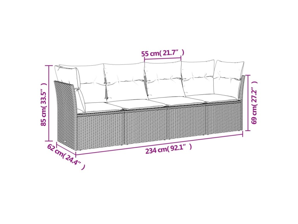 Tato zahradní sedací souprava je dokonalým doplňkem vaší zahrady, terasy nebo dvorku a poskytne vám pohodlné a příjemné místo, kde si můžete povídat s rodinou a přáteli nebo jen tak odpočívat a užívat si pobyt venku.