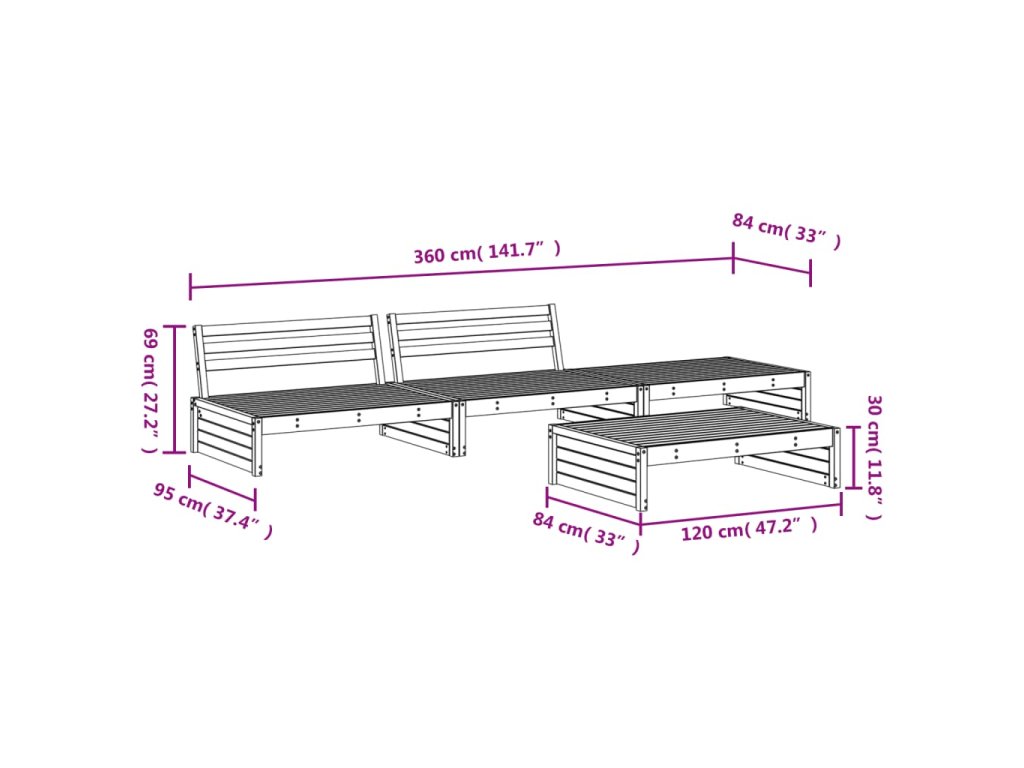 - Rozměry středové pohovky: 120 x 95 x 69 cm (D x Š x V)