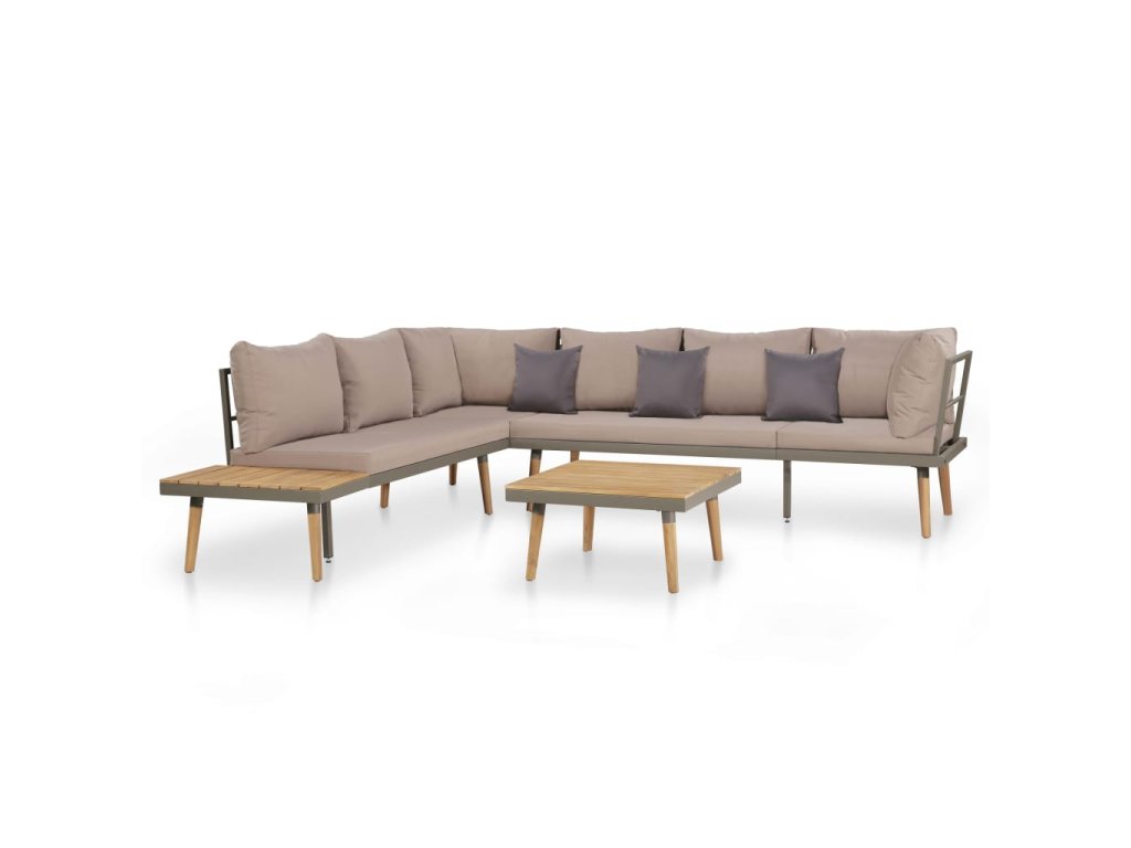 Balení obsahuje 1 dvoumístnou pohovku, 1 trojmístnou pohovku, 1 rohovou pohovku, 1 konferenční stolek, 8 polštářů na opěradlo, 4 podušky na sedák a 3 polštářky.