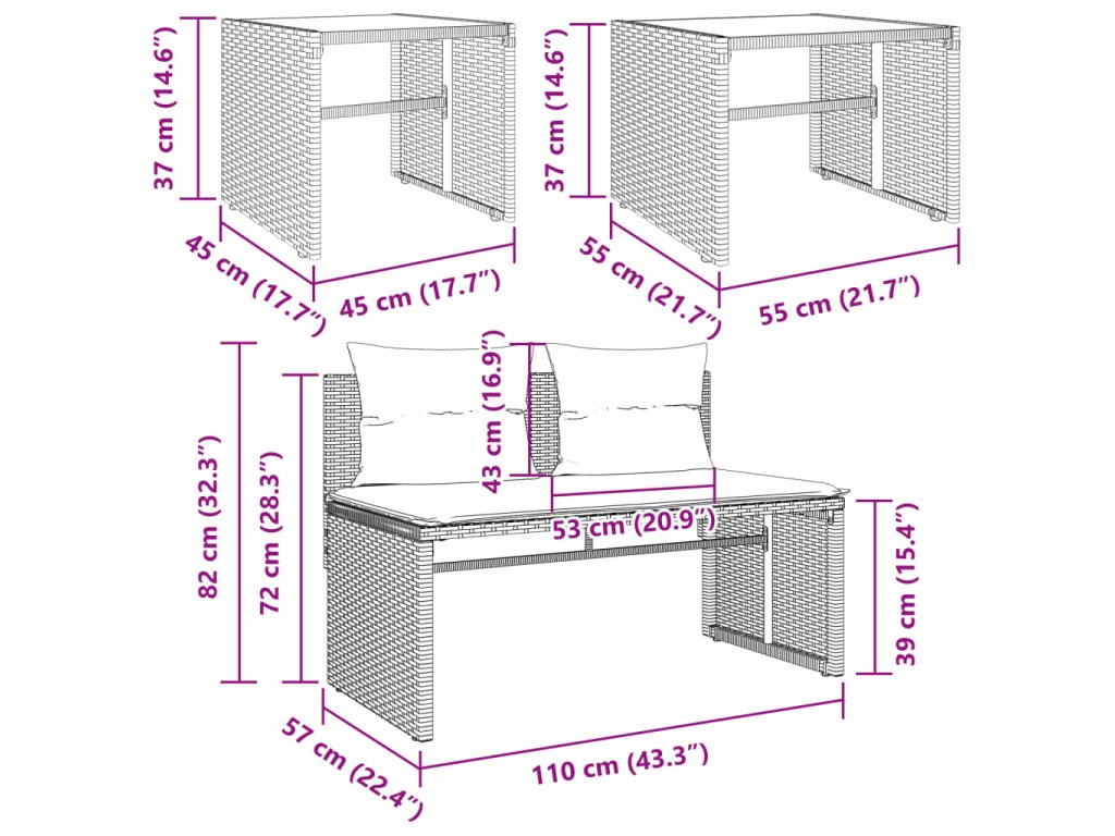 Tato zahradní sedací souprava je dokonalým doplňkem vaší zahrady, terasy nebo dvorku a poskytne vám pohodlné a příjemné místo, kde si můžete povídat s rodinou a přáteli nebo jen tak odpočívat a užívat si pobyt venku.